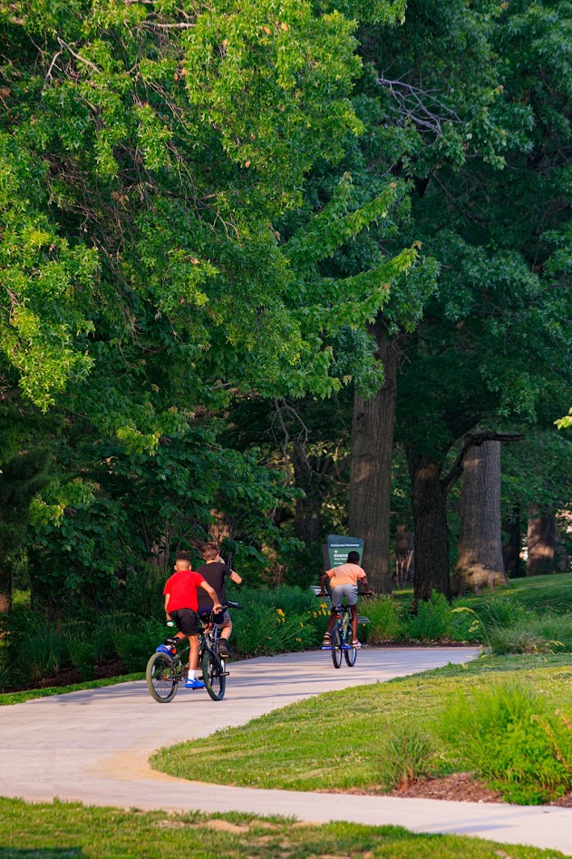 Start in Warson Park where the greenway begins at Warson Rd. Head east on the greenway to the far end of Warson Park. The greenway turns north (this section opened in spring 2025!) and continues through the adjacent neighborhood. Be sure to check out the nature playscape in Indian Meadows Park. There is also a rain garden near Napoleon Blvd. that captures rainwater during storms. Depending on the time of year, you might see some of the 300 native-to-Missouri trees and bushes in bloom along the newest section of greenway. When this greenway was planned, the Olivette community made it clear that native landscaping was a priority! Turn around at Dielman Rd. and walk back to where you started for a total of 2.6 miles, or, to make this a 3.14 mile walk, turn around and head east again to where the path splits. This time, go right and follow the trail to loop around the two baseball fields in Warson Park and back to the parking lot next to Five Oaks on Warson, the Olivette Community Center. Plan your trip here.