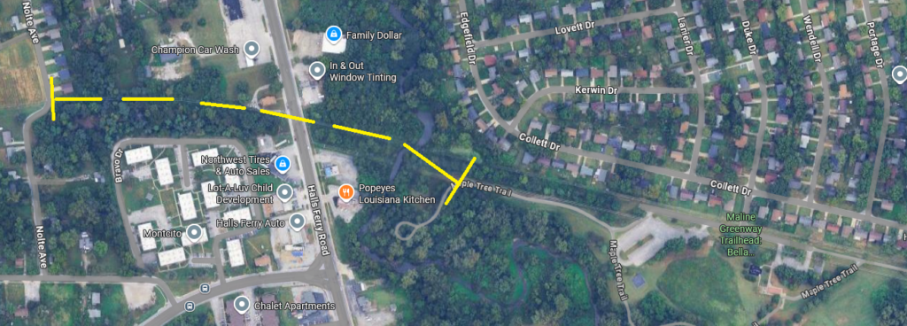 We are seeking federal funds for the second phase of our our project to extend the Maline Greenway from Bella Fontaine West County Park to West Florissant Avenue. The first phase, expected to go into construction in 2027, is a greenway from West Florissant Avenue to Nolte Avenue. The second phase is a .5-mile section of greenway starting at Nolte Ave. which features a walking and biking bridge across Halls Ferry Road and Black Jack Creek to connect to the existing paved trails in Bella Fontaine West County Park. Share your comments about the second phase of Maline Greenway here.
