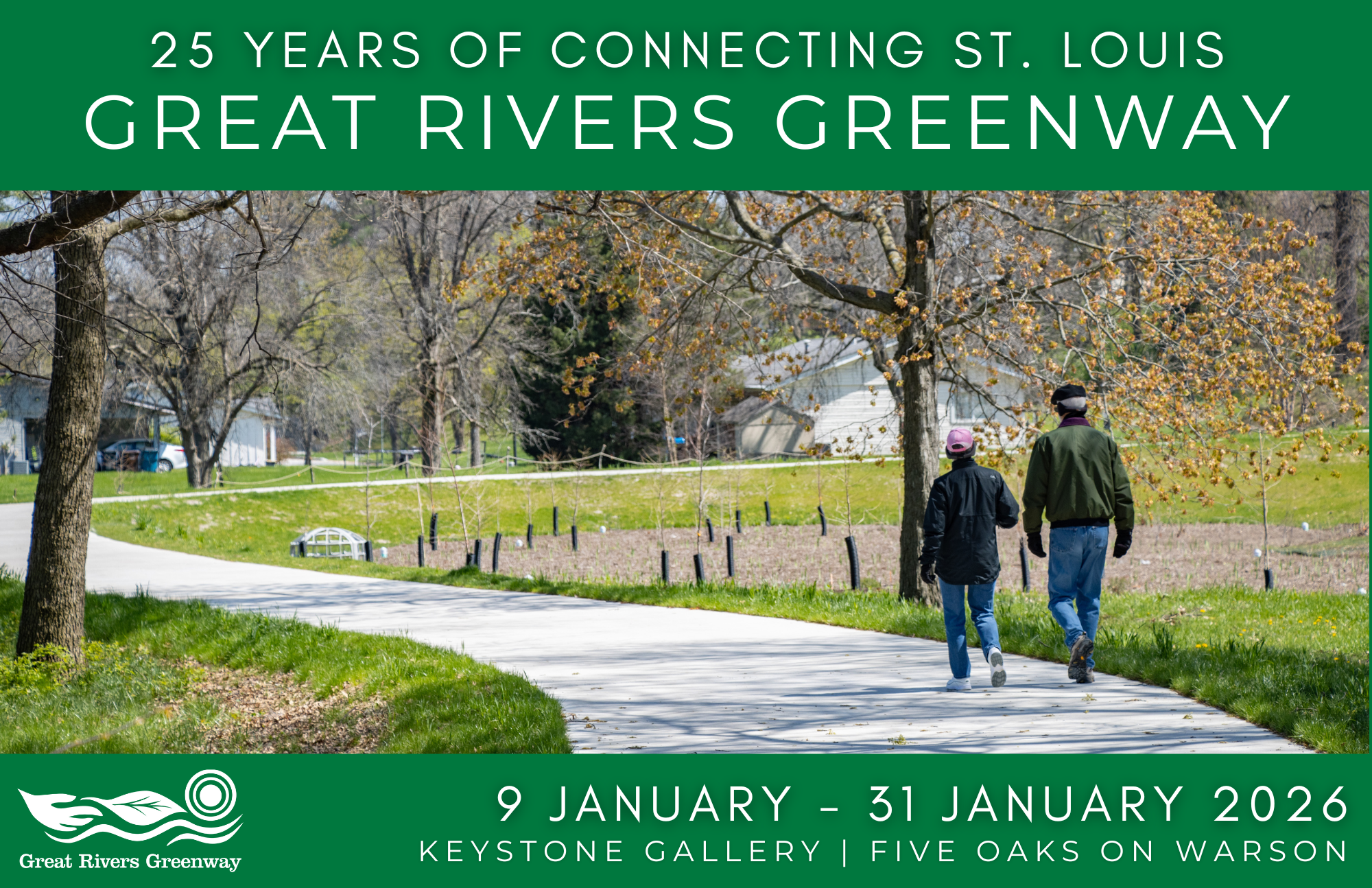 Join us Friday January 9 for the opening Reception of Great Rivers Greenway: 25 Years of Connecting St. Louis exhibit at Five Oaks on Warson in Olivette. Stop by any time between 6-8pm to mix and mingle, enjoy light refreshments, and talk greenways!