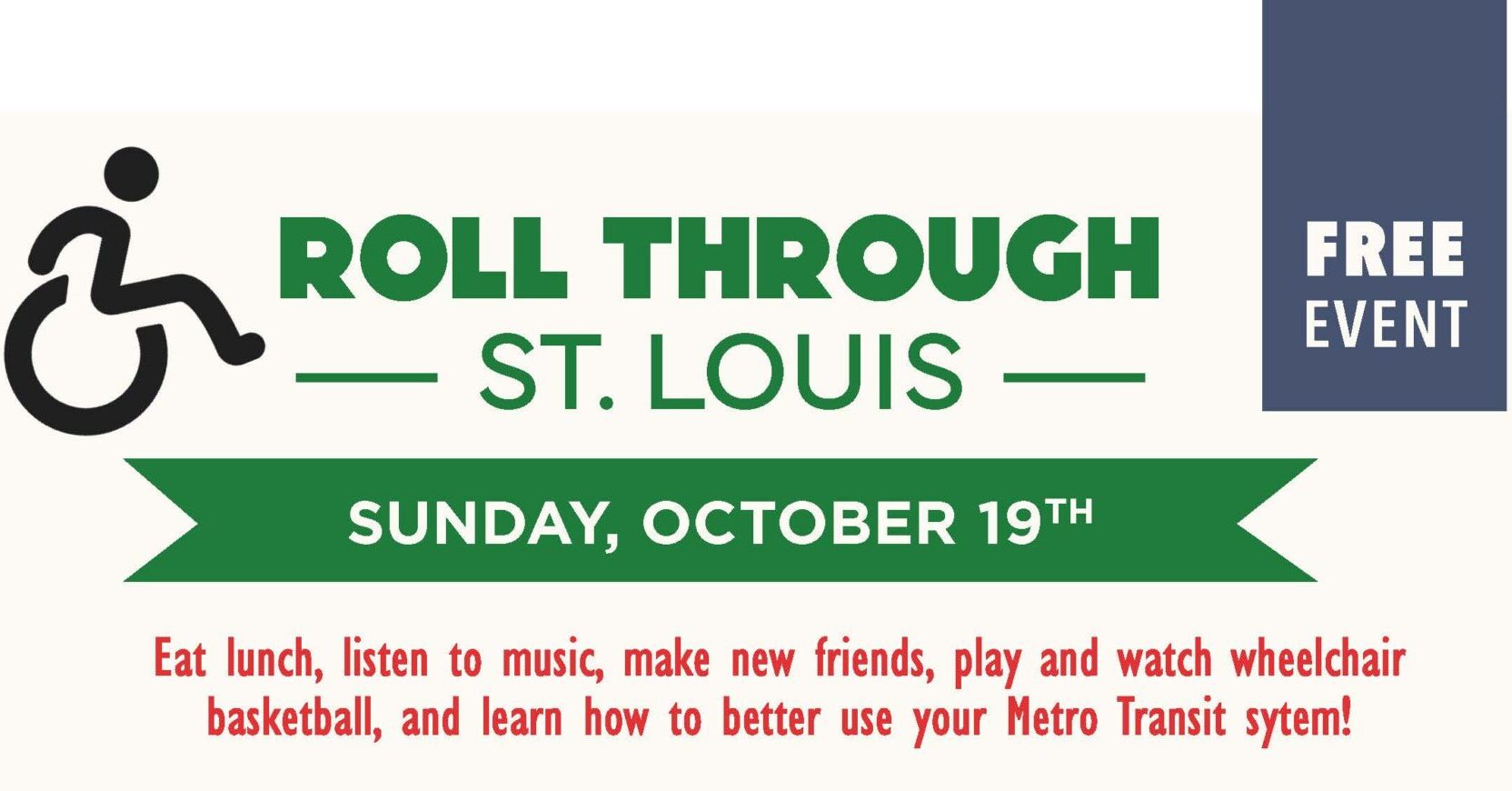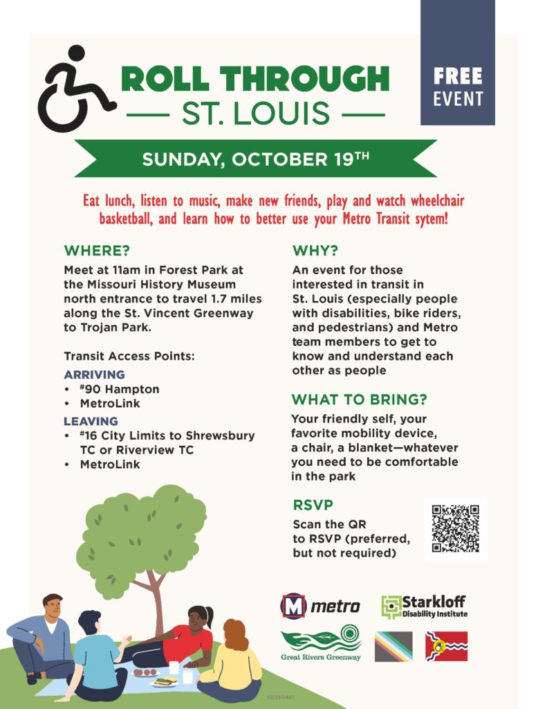 Eat lunch, listen to music, make new friends, play and watch wheelchair basketball, and learn how to better use your Metro Transit system! Meet at 11am in Forest Park at the Missouri History Museum north entrance to travel 1.7 miles along the St. Vincent Greenway to Trojan Park. This is an event for those interested in transit in St. Louis (especially people with disabilities, bike riders, and pedestrians) and Metro team members to get to know and understand each other as people. Bring your friendly self, your favorite mobility device, a chair, a blanket – whatever you need to be comfortable in the park.