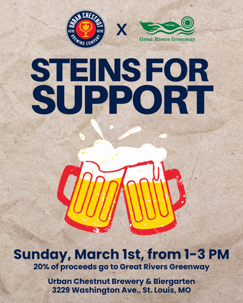 Come raise a glass (or a tasty snack!) to your greenways! Join fellow Great Rivers Greenway supporters on Sunday, March 1, between 1:00-3:00 at Urban Chestnut Brewing Company’s Midtown Brewery & Biergarten where 20% of proceeds on food and drink orders will be donated to GRG. No registration required!