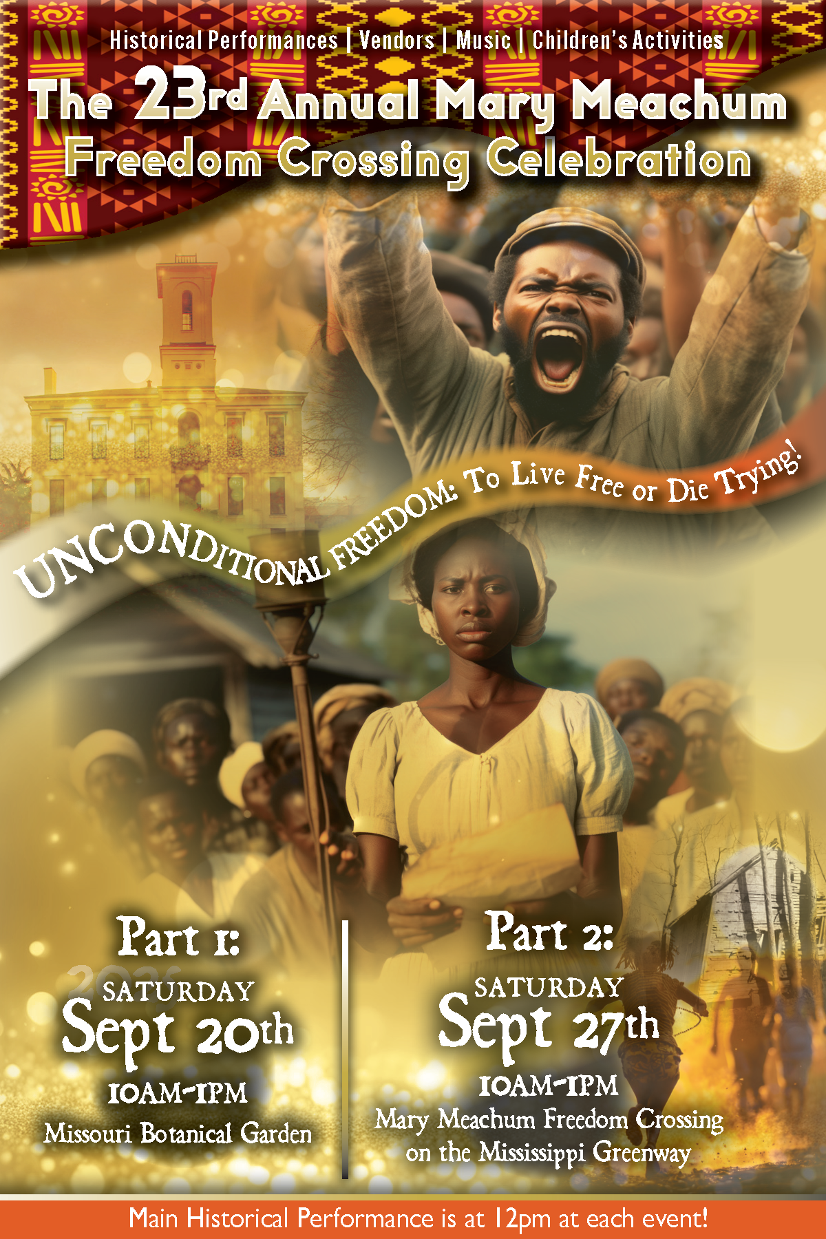 The 2025 Mary Meachum Freedom Crossing Celebration was a two part event that highlighted the story of the people who Mary Meachum led to seek their freedom from enslavement by Henry Shaw at the site of today’s Missouri Botanical Garden. The theme was “Unconditional Freedom: Live Free or Die Trying”. Photos here of part 1.