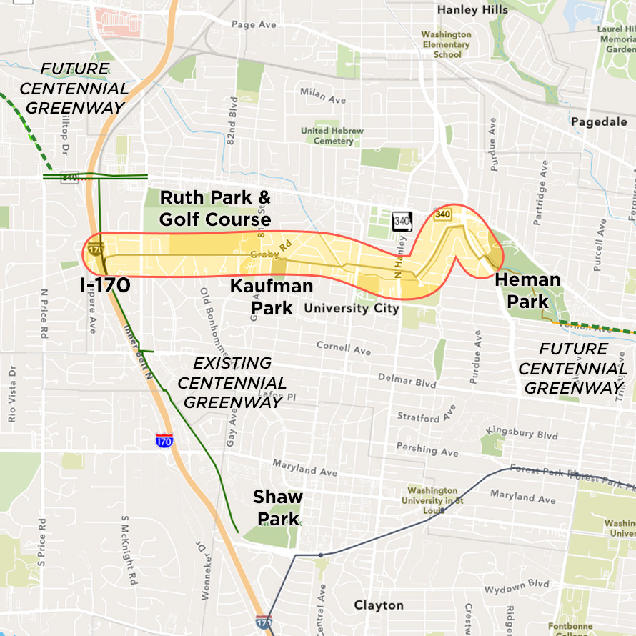 An alignment for Centennial Greenway between Heman Park and Groby Road was under consideration in 2014 but Great Rivers Greenway faced physical, environmental and financial challenges in advancing the project. GRG is now interested in considering alternative alignments to complete the greenway between Heman Park and I-170.