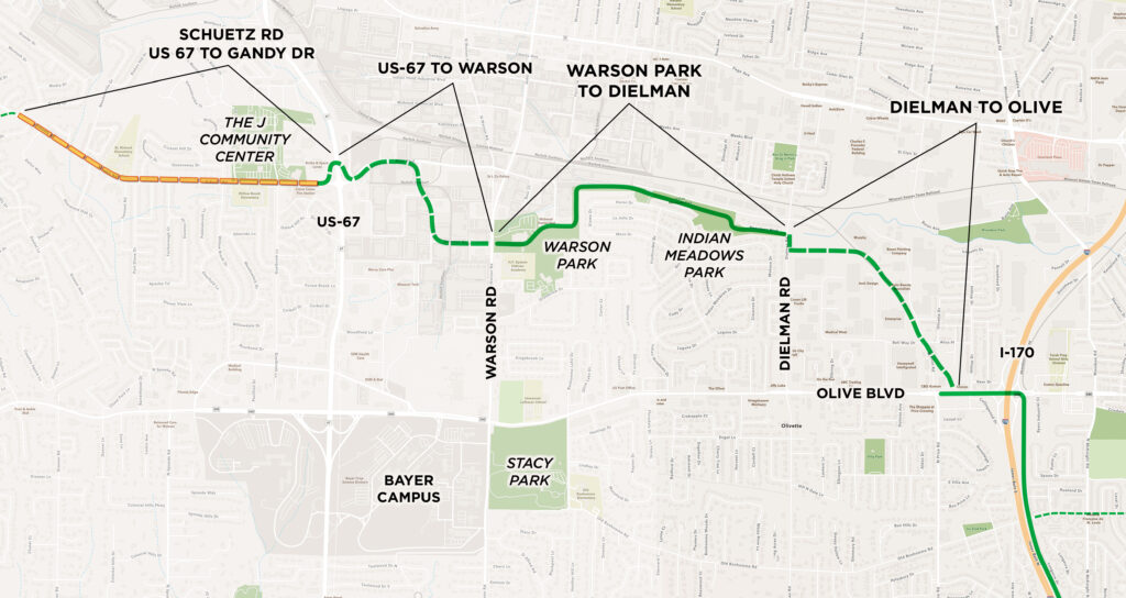 Great Rivers Greenway and St. Louis County are partnering to build an extension of the Centennial Greenway along Schuetz Road in unincorporated St. Louis County in conjunction with the county’s planned roadway and pedestrian enhancements. This collaboration will not only advance the overall plan for the Centennial Greenway, but also significantly reduce costs and accelerate the project timeline.