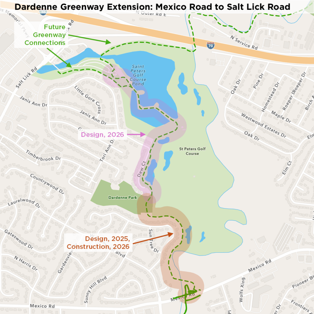 In February 2024, this project was awarded $1.5 million in federal funding to improve the connection between Mexico Road and Dardenne Park! The next steps will be working towards developing the final construction documents for the segment between Mexico Road and Dardenne Park with a goal for construction of this section in spring of 2026.