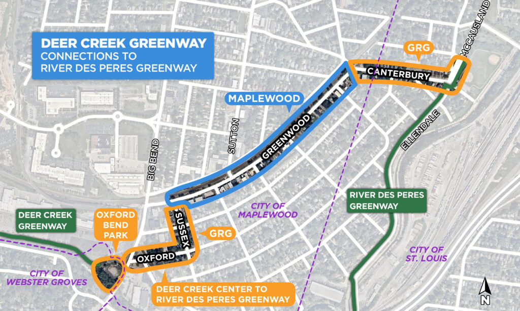 The goal of this project is to extend the Deer Creek Greenway from its current endpoint at Big Bend Blvd. to connect to the River des Peres Greenway at the intersection of Ellendale and Canterbury in the City of St. Louis. It will create a greenway connection between the cities of Brentwood, Webster Groves, Maplewood and St. Louis with connections to Deer Creek Shopping Center, the Maplewood business district, surrounding neighborhoods, multiple parks and the Shrewsbury Lansdowne MetroLink station.