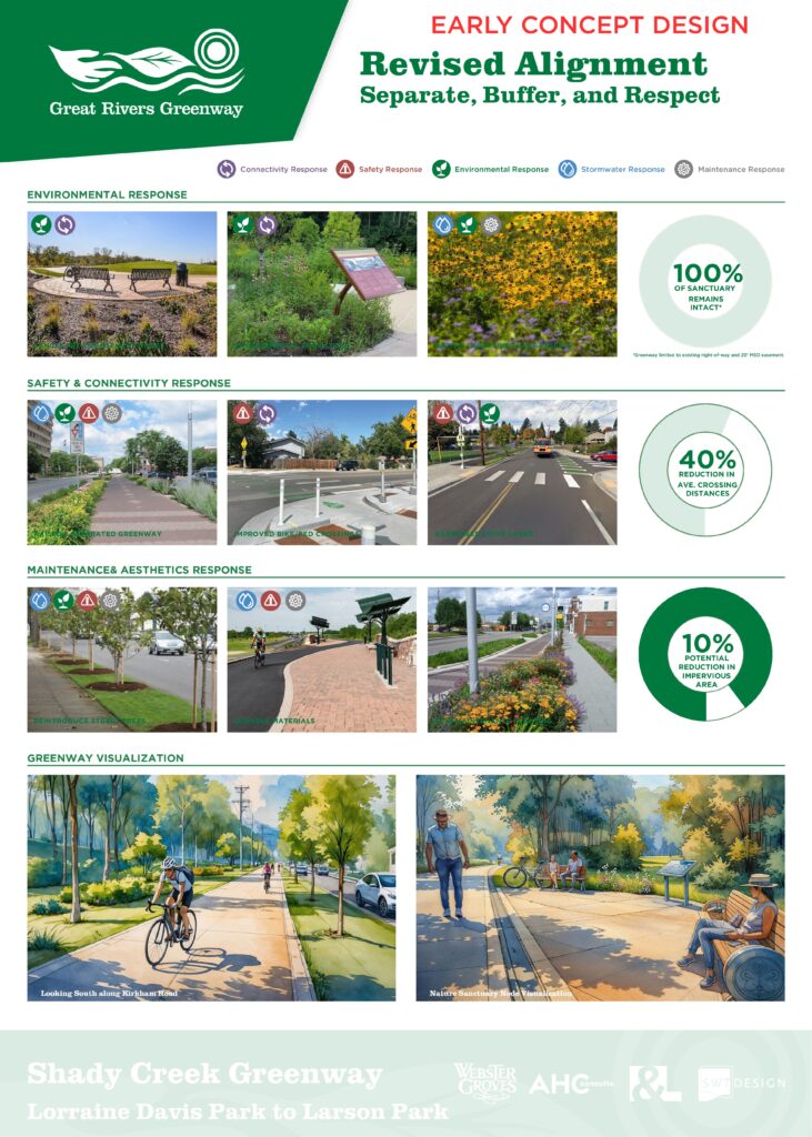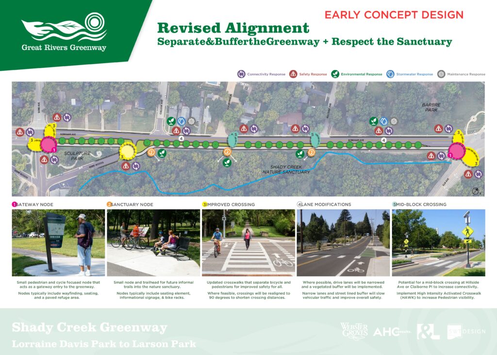 Metropolitan Sewer District (MSD) is currently working on a major storm sewer project along Kirkham Avenue. This project presents an opportunity to build a small 0.36-mile segment of Shady Creek Greenway between Elm and Gore following the completion of the sewer project, reducing temporary impacts to traffic and greenway construction cost. In 2006, this area was identified as a potential route in the Shady Creek and Deer Creek Concept Plan that recommended a connection between Lorraine Davis Park and Larson Park in Webster Groves. With this storm sewer project underway, we are working with our partners at the City of Webster Groves to hear what the community thinks about a greenway in this area and understand their current priorities for other connections in Webster Groves.